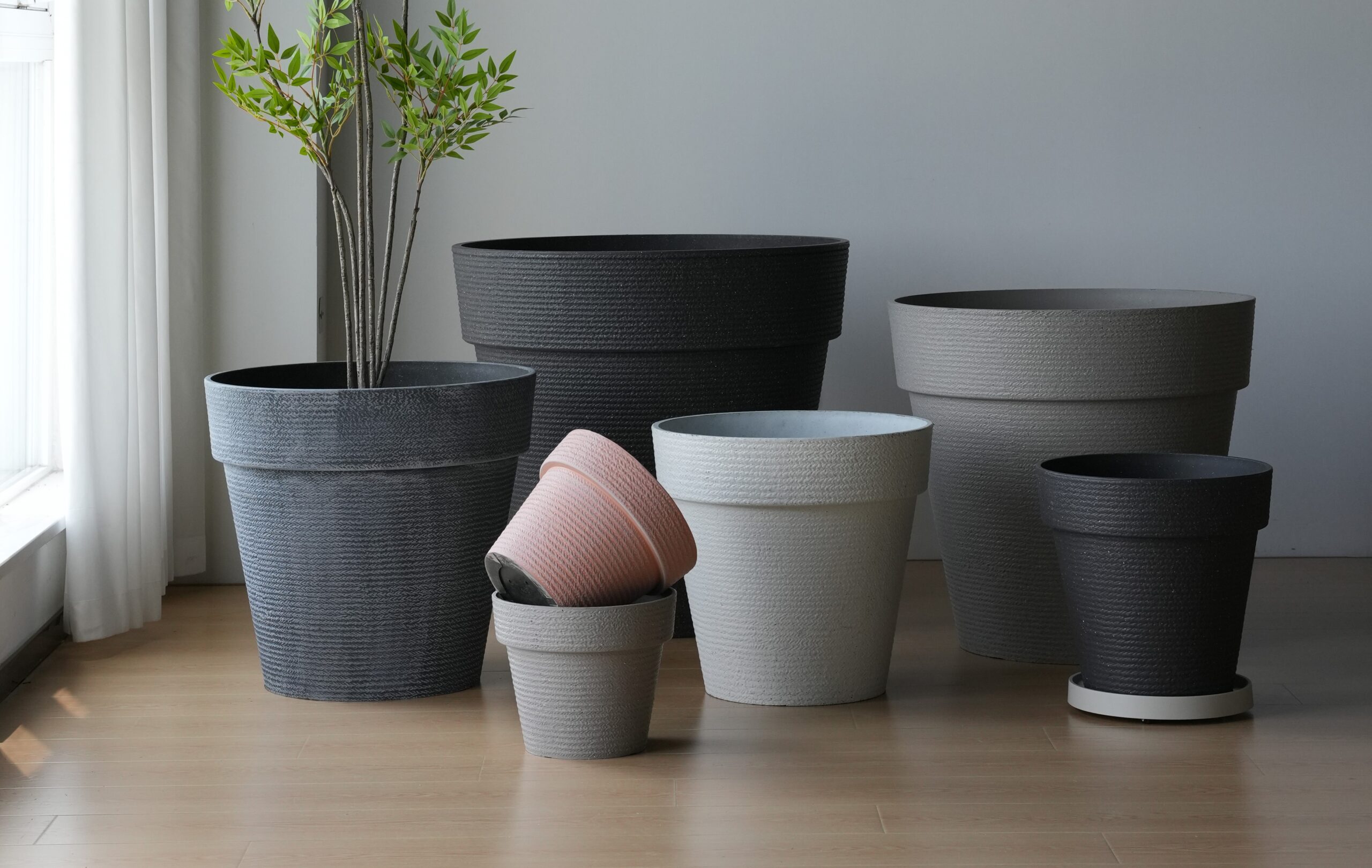 Large circular planters with a stone-textured finish, sturdy and durable, suitable for outdoor landscaping. From GP-1 to GP-6, they gradually increase in size, accommodating plants of different specifications to create richly layered garden landscapes.